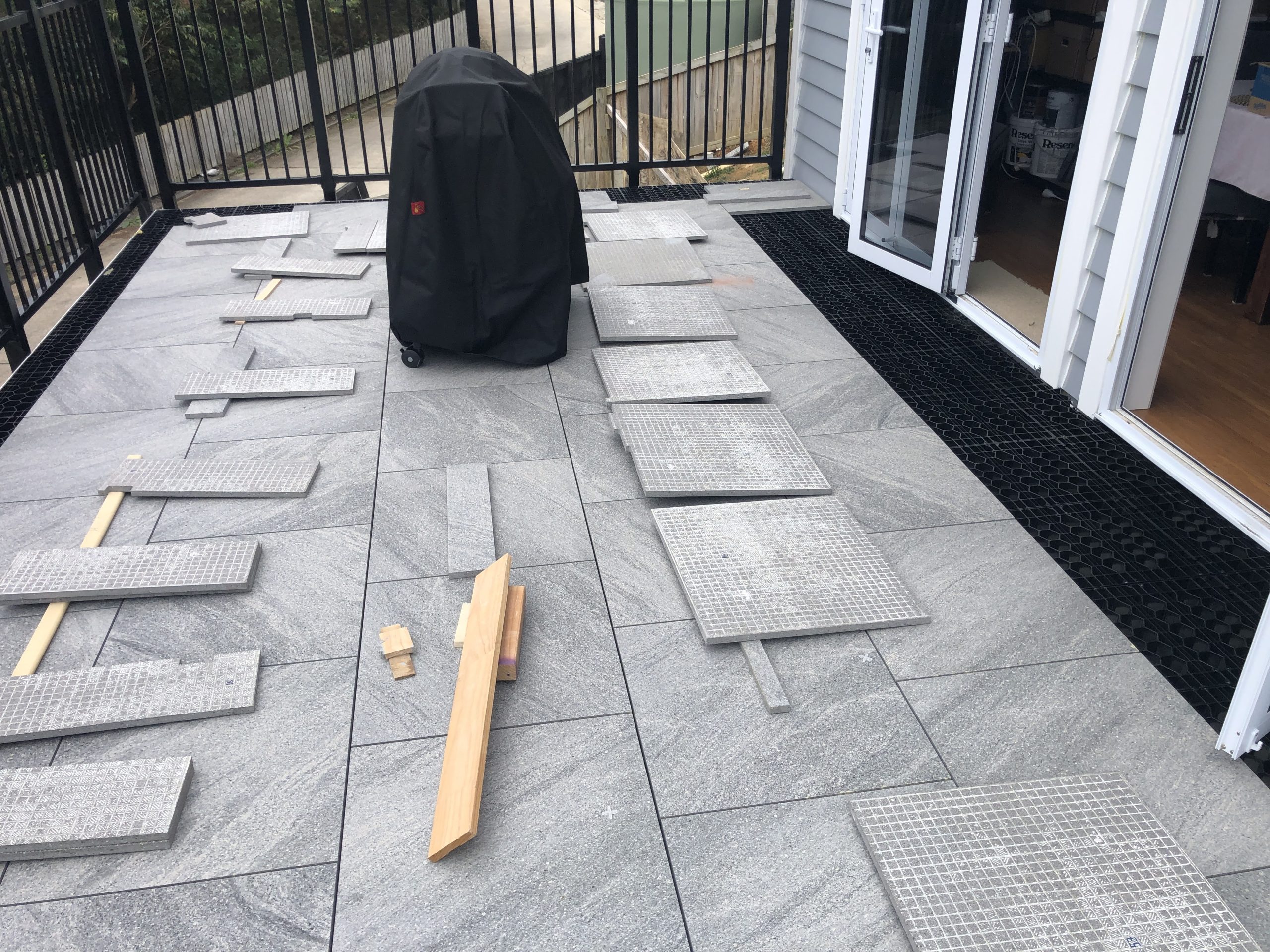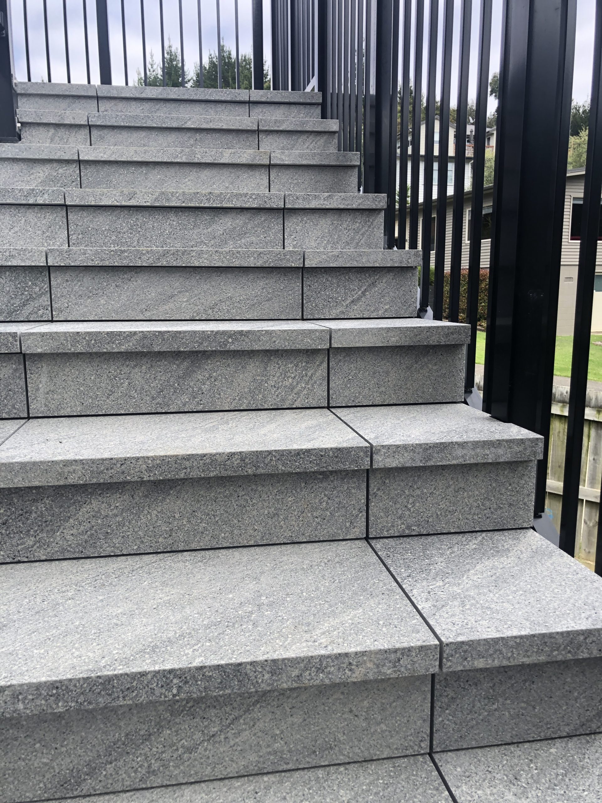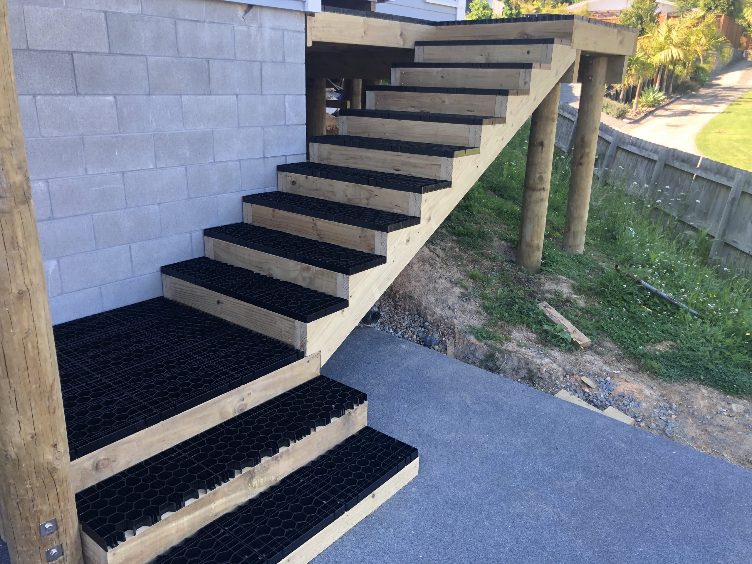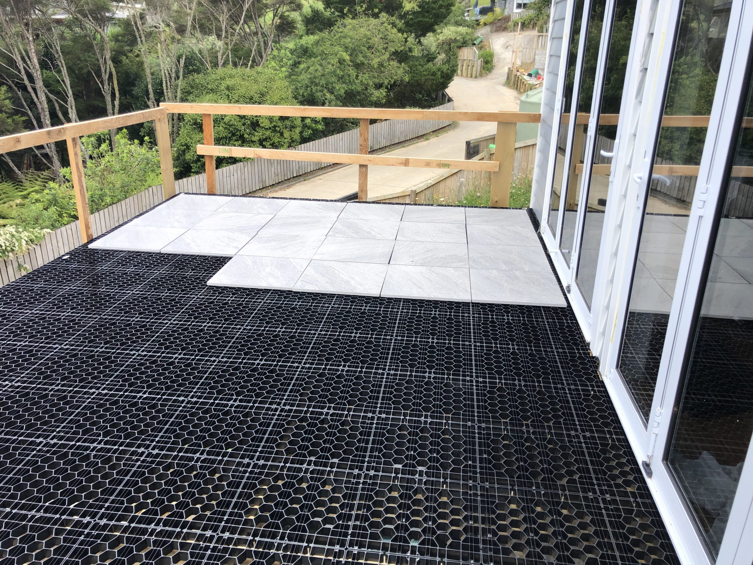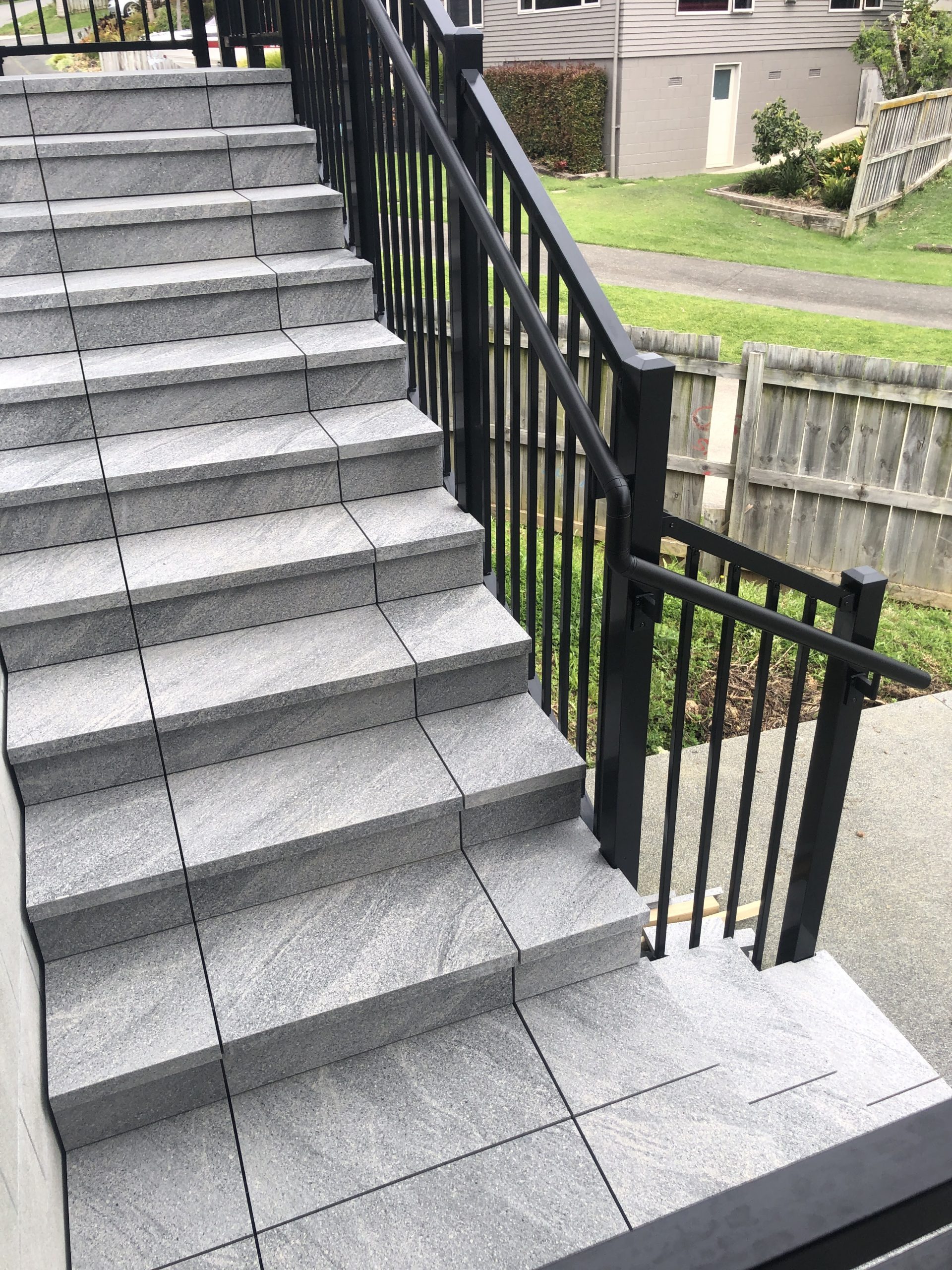 This DIY deck in Maraetai showcases the versatility of the Silca System, allowing for a seamless 20mm porcelain tile installation over a timber subframe. Designed for durability and long-term performance, the system provides a stable, low-maintenance surface perfect for the coastal environment. The homeowner’s attention to detail is evident throughout, particularly in the stair set area, where a drop-face coping tile with a matching tile upstand creates a seamless, polished finish. By using Silca Grates, they achieved a professional, high-end result with excellent drainage and airflow beneath the tiles. The result is a functional and aesthetically refined outdoor space that blends effortlessly with its surroundings.
